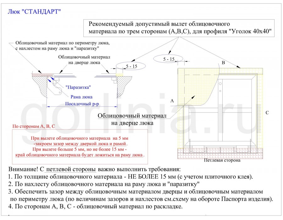 Инструкция по технологическим зазорам, вылетам, наклейке плитки на дверцу и раму.