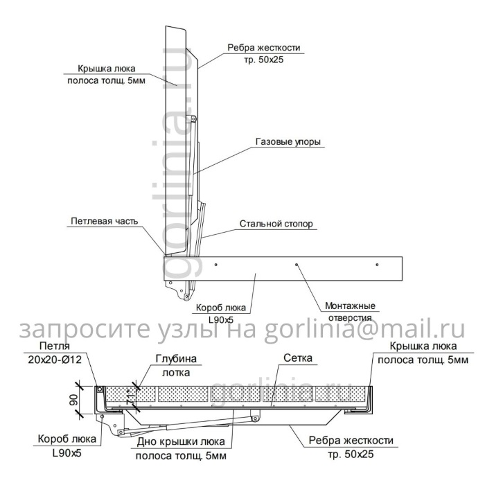 Корпус выпускается из углового профиля горячего проката с толщиной стенки 5-6 мм; корыто - из листового проката 5-8 мм с обвязкой по дну профильной балкой 50х25. Метод сборки: аргонно-дуговая сварка сплошным проваром с присадками меди. Металлические части обработаны цинкосодержащим покрытием, колерованы полиэфирной эмалью. Тяжелонагруженные крышки комплектуются газлифтами 2000N.