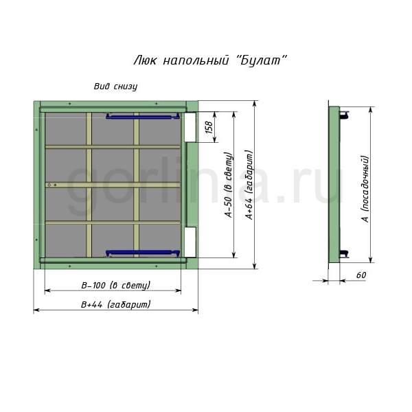 Облегченная коробка из профилированного листового проката 3 мм с наличником - есть ограничения по монтажу, свяжитесь с нами! Каркас дверки с обвязкой сварен из трубы 30х20, заполнен ГВЛ под чистовую отделку. Конструкция смещенного за ось шарнирного соединения сохраняет лаза в чистоте 1150х600 для удобства спуска по лестнице в подвал.