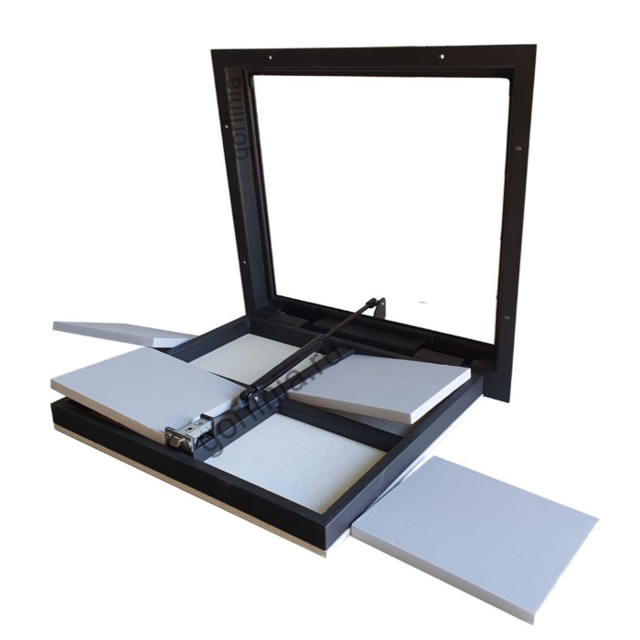 Облегченная рама из листового проката 3 мм с наличником для установки в поверх черновой стяжки в нулевую отметку полов. Каркас с обвязкой сварен из трубы 30х20, обшит ГВЛ над утеплителем под финишную отделку плиткой.